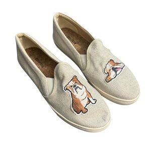 Adorable slip on sneakers. Bull dog patches on front. Some normal wear to bottoms. Please refer to pics.