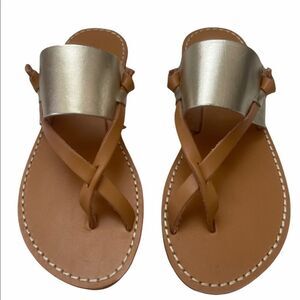Simple and intriguing all at once, this understated leather sandal features a metallic upper, tan nubuck thong straps, and a smooth leather footbed. The contrast keeps things interesting, but the minimalist construction means you can wear them with anything and everything.