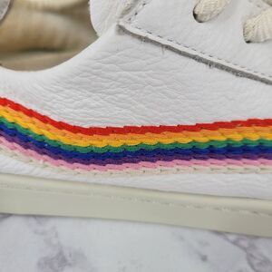 Stylish white sneakers featuring a vibrant rainbow stripe and sun design. Perfect for adding a pop of color to any outfit.