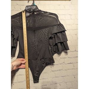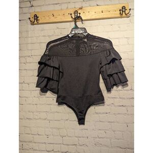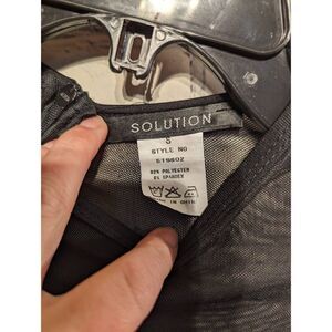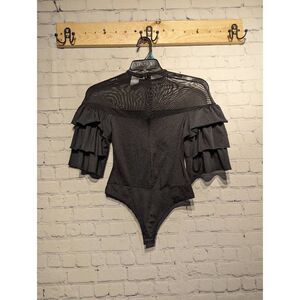 Solutions black short sleeve bodysuit with sheer shoulders and zipper closure in the back. Buttons at the crotch. Size small. In excellent condition.
