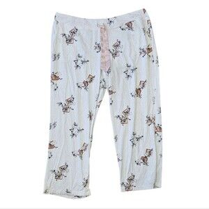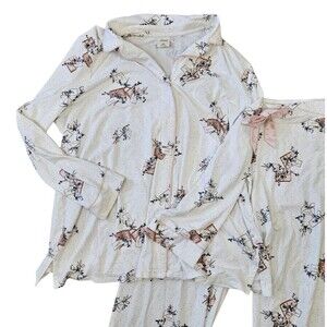 These womens size extra extra large pajamas are white with paper wrapped presents all over. Top is long sleeve with full front buttons. Pants are pull on style with a satin waist tie. 57% cotton 38% modal 5% spandex.