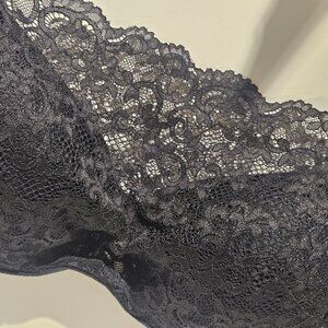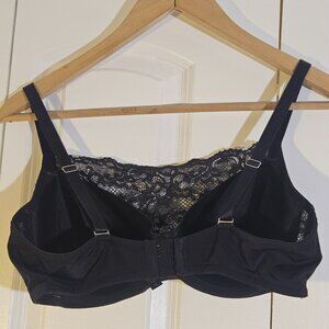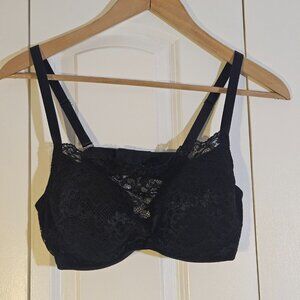 Beautiful black lace cami bra size 38D. Underwire, convertible straps (can be crossed in the back). Lace accent in the front is perfect for under a low cut top for modesty. Very gently worn, in excellent pre-owned condition. See photos for details and condition.