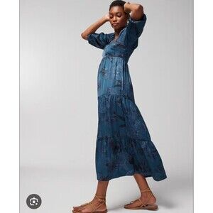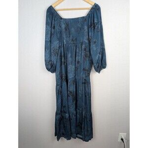 Soma Bra Dress Womens Large Blue Black Floral Maxi Boho Puff Sleeve Tiered Satin