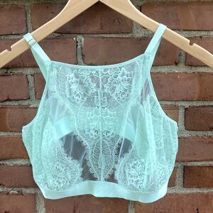 Mesh and intricate lace details combined with a high neck silhouette for an elevated layering look. Unlined mesh with sheer lace overlay.