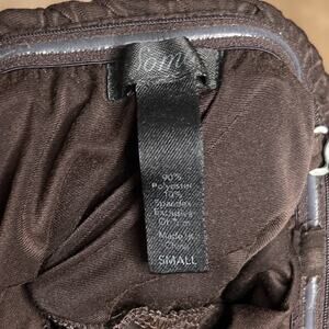 Brown stretchy stress with a soft material. Multicolor paisley print along the hem. Pull on closure, spaghetti straps that are removable to convert to a strapless dress.