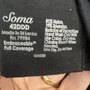 Soma Embraceable Full Coverage Bra 42DDD Black Underwire 031503