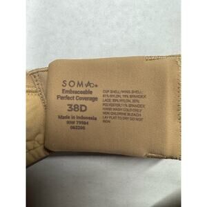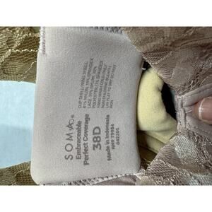 This listing includes two Soma Embraceable Perfect Coverage bras in size 38D — one in nude and one in blush pink. Both offer Soma’s signature comfort with smooth microfiber fabric, light padding, and lace trim details for an elegant everyday look.