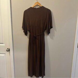 This Soma maxi dress features a soft, flowing silhouette with an empire waist and a graceful V-neckline that drapes beautifully. Designed with airy flutter sleeves and a lightweight fabric, it moves effortlessly and gives off an ethereal Fairycore feel blended with earthy, goddess-inspired elegance. The rich brown tone adds warmth and depth, making it perfect for day-to-night wear, special moments, or styled casually with boots or sandals. Size small.