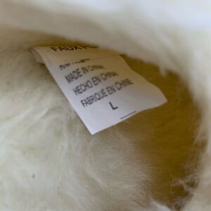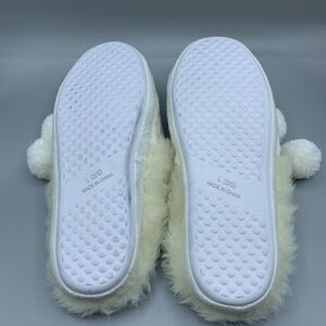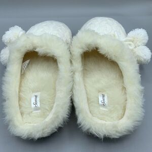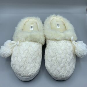 Soma Faux Fur Cable Knit Pom Pom Slippers. Cozy and comfy slide on cable knit faux fur slippers. Size Large. Fits shoe size 8/9. New without tags.