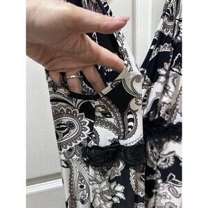 Indulge in a luxurious and comfortable night's sleep with this stunning Soma Intimates Long Maxi Nightgown. The gorgeous paisley pattern in black and white adds a touch of elegance to this classic and sexy gown. The V-neckline and sleeveless design provide a flattering and breathable fit for all seasons. Crafted from a blend of polyester and spandex, this machine-washable gown offers stretch and ease of wear. Perfect for any occasion, this gown is a must-have addition to your sleepwear collection.