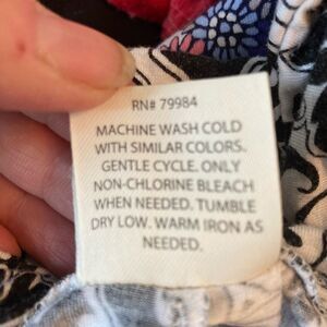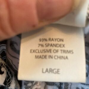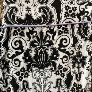 Really gorgeous black & white stretch rayon jersey pj bottoms. Has great pockets. Beautiful lavender satin ribbon & bow to elastic drawstring waist as well as piping at top of cuff on leg. Waist flat is 15.5” before stretch. High rise is 11”Inseam is 29” Top to bottom 38”. Full length. No wear or flaws.
