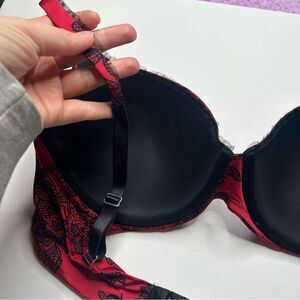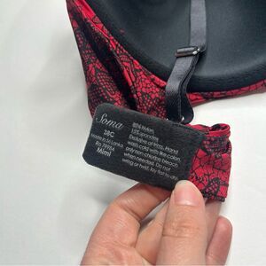 This Soma bra combines a deep red base with intricate black lace pattern , offering both elegance and support. The underwire design with molded cups ensures a flattering shape, while adjustable straps provide a customizable fit. Perfect for adding a touch of sophistication to your intimates collection.