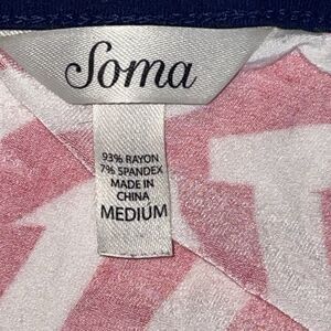 The Soma striped pajama tank top in size M is a stylish and comfortable addition to any woman's sleepwear collection. Made from a blend of spandex and rayon, this sleeveless top features a V-neckline and pullover closure for easy wear. The red and white striped pattern gives it a nautical-inspired look, perfect for any season. The lightweight fabric ensures a breathable and comfortable fit, making it ideal for both warm and cool weather. Pair it with matching bottoms for a cozy and classic sleep ensemble from this trusted brand.