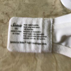 Soma Sensuous lace bra with full coveraage and in an off-white color called champagne dream. Size 38 C. Strap has 3 latch closure. Adjustable straps, lightly lined with underwires. Scalloped lace overlay detail. In good condition, no discoloring- photos show a bit of yellowing, but it is just the off-white shade of the interior lining. A tiny bit of pilling on inside of closure material.