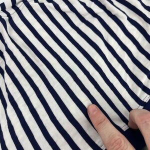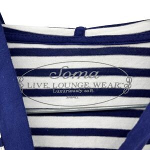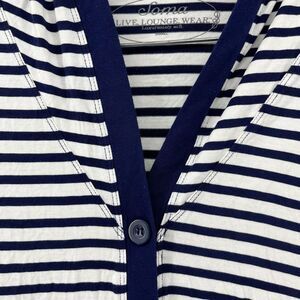 Keywords: Soma, striped cardigan, hooded cardigan, duster, button front, long sleeve, lightweight, casual, loungewear, cover-up, navy, white, small