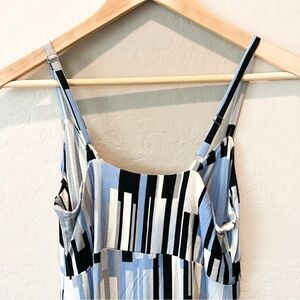 Soma maxi dress, geometric stripe maxi, twist front dress, black blue cream dress, stretchy knit maxi, sleeveless adjustable dress, XS Soma NWT, Soma resortwear, lightweight rayon dress, pull-on maxi, Soma summer dress, Soma twist bust dress, comfortable vacation dress, modern pattern maxi, sleeveless stretch dress, tropical getaway outfit, women's XS maxi