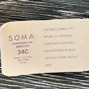 The Soma Vanishing 360 Full Coverage Nude T-Shirt Bra in size 34C is a wireless, adjustable bra designed for full coverage. Made from a nylon and spandex fabric in a solid beige color, this bra features bra strap accents and a hook & eye closure. The Soma brand is known for its quality and comfort, making this bra a classic choice for women looking for support and style. Ideal for everyday wear, this bra is hand wash only and offers a seamless, opaque design.
