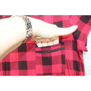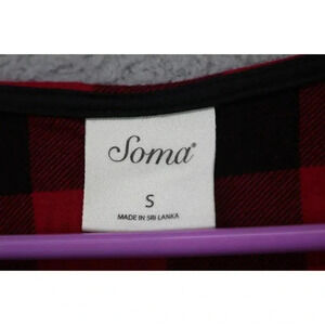 This is a Soma Women's Red and Black Check Night Gown or Sleepshirt that is a size Small. It is 93% Rayon and 7% Spandex. Laying flat, it measures: Armpit to armpit-19" and the length is 34". It is in great condition.