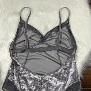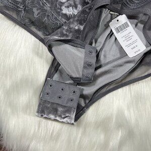 Soma Women's Size Medium Gray Velvet Illusion Excalibur Bodysuit Teddy Lingerie, 93% Polyester 7% Spandex, Stretch, Adjustable Spaghetti Straps, Lace Trim, Open Back with Elastic Band
