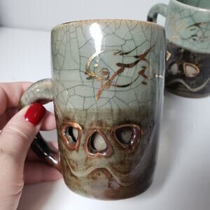 Somayaki Japaneese Tea Cups Set Of Two Earthy Crackle Glaze Gold Horse Mugs 2Pc