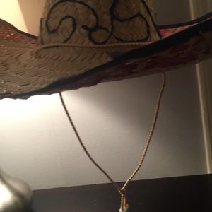 Hand woven sombrero made in Mexico with blue and red straw woven in for detail. Also has a string to go around your chin or neck.