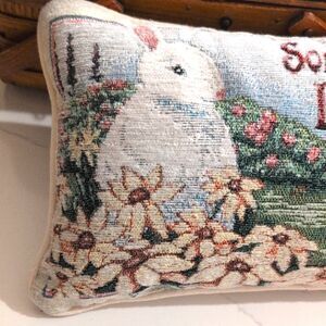 Some Bunny Loves You Decorative Tapestry Accent Pillow. Add charm to your home with this delightful 'Some Bunny Loves You' decorative pillow. Featuring adorable bunnies and floral accents, this pillow is perfect for the holiday season. The soft cream and green tones bring warmth and style to any room.
