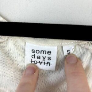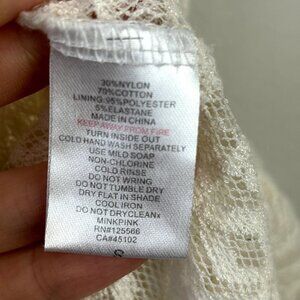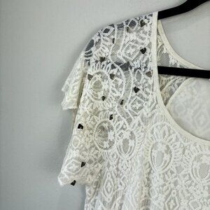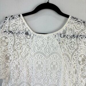* Features: nylon / cotton blend, cream / off white lace, tunic length, short sleeves, embellished sleeves, scoop neck