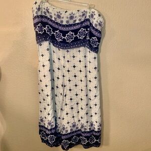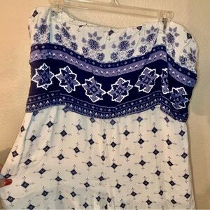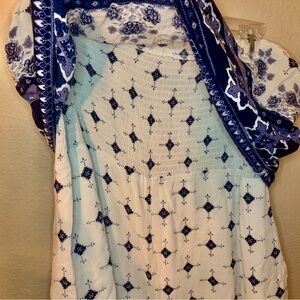Blue and White with Geometric & Floral Patterns. Elastic waist and straight neckline.