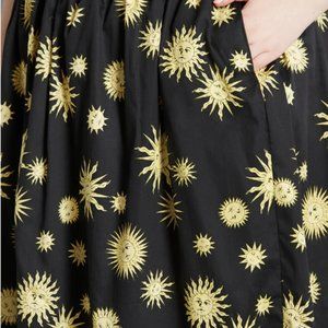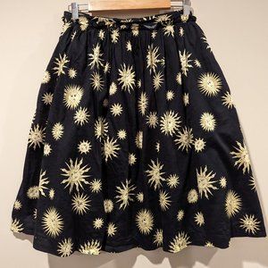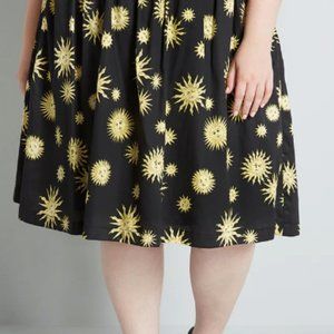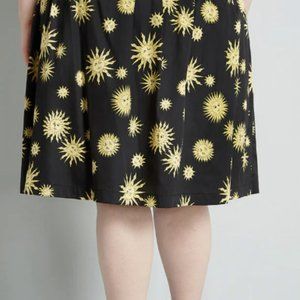 On some sun-soaked Saturday, put on this effortlessly chic, 40s-inspired A-line skirt from our ModCloth namesake label. Take a leisurely stroll feeling so retro-fab with the lightweight black woven fabric fluttering softly in the breeze, showcasing an all over hand-drawn print featuring many mystical faces adorning an array of yellow celestial suns. The waistband that is adorably adorned by subtle ruffle detailing throughout, and the handy side pockets add just the right amount of swagger to this high-waisted knee-length skirt as you arrive in sweet style to a summer soiree.