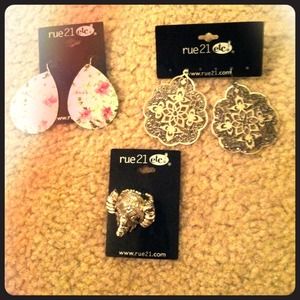 2 pairs of super cute, trendy dangle earrings and an attention grabbing elephant ring. New with tags.