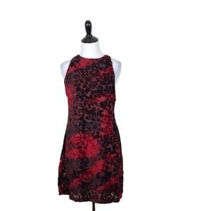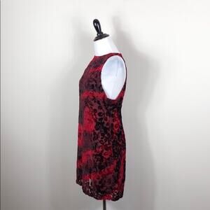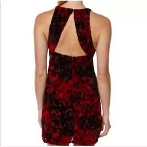 Somedays Lovin red floral velvet back cutout dress. Hidden back zip closure. Lined bodice. Semi sheer overlay - may require shapewear. 100% nylon. Flocking 100% viscose. Lining 100% polyester. New with tags.