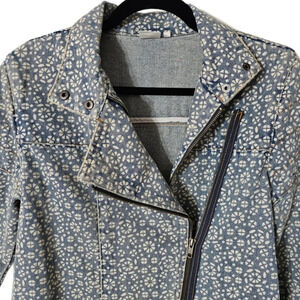 Some days Lovin Floral Print Long Denim Jacket sz small, worn once and is in excellent condition, no holes, rips, stains or tears. Light wash denim with slight distressed look, white floral pattern throughout, asymmetrical zip front closure, 2 front pockets, relaxed fit and has drawstring pull ties at hem.