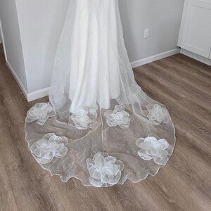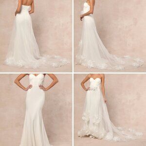 A breathtaking ivory maxi with an elegant and romantic design. The dress features a fitted strapless bodice with a sweetheart neckline, hidden no-slip strips, and built-in boning and underwire for support. A detachable sheer organza overlay drapes from the high waist, covered in oversized 3D floral appliqués that create a beautiful, sculptural look. The crepe-knit skirt flows into a soft mermaid silhouette with a godet back and slight train for graceful movement. Hidden back zipper with clasp closure.