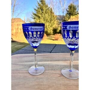 Somerset Cobalt Blue Cut to Clear Crystal Wine Glasses 6.75”~Set of 2
