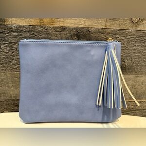 Elevate your wedding day look with this stunning Something Blue Zip Clutch With Tassel. The clutch features a beautiful blue exterior made of high-quality faux leather, adding a pop of color to your outfit. The zip closure ensures that your essentials stay safe and secure, while the tassel accent adds a touch of elegance and sophistication.