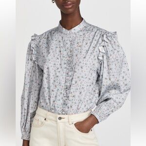 A lightweight Something Navy button down, detailed with a ditsy print and tidy ruffles for a lovely look. Colar is a blue/gray