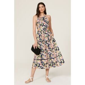 Stylist Notes: Blooming roses pattern this Something Navy midi dress styled with a high neck, side cutouts, and a voluminous skirt.