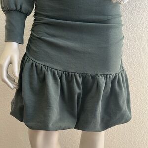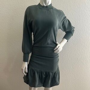 The Something Navy dress in a rich green hue features a ruched and ruffled design, perfect for casual or work settings. With its long bishop sleeves and a mock neck, this sweater dress offers a stylish yet comfortable fit. The mandarin collar adds a touch of elegance, while the soft fabric ensures a flattering drape. Ideal for those seeking a blend of casual comfort and feminine charm.