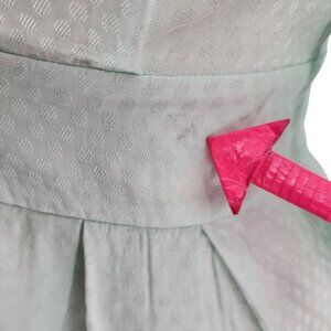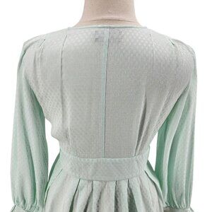 Long sleeve fitted V-neck blouse wrap top - shade of light mint green. Made of a jacquard fabric with a polka dot like pattern. Inner button with 2 claps closure. 100% Viscose. Party, cocktail, going out, date night
