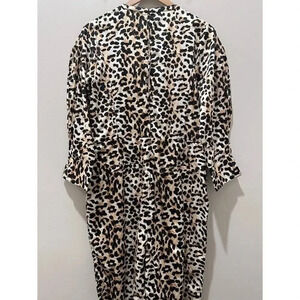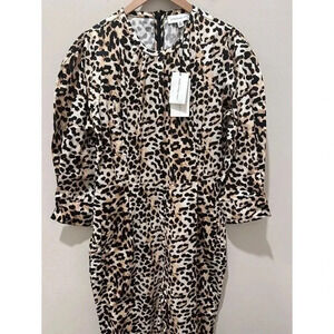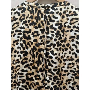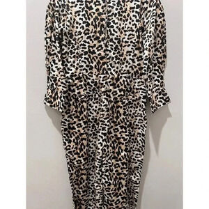 Stylish leopard print jumpsuit. Features puff sleeves and cinched waist. Perfect for a chic look.
