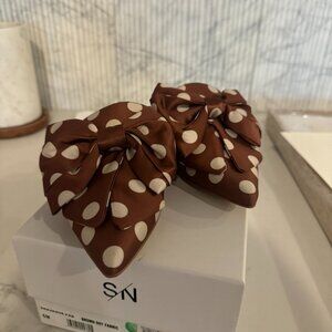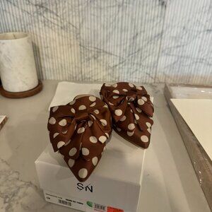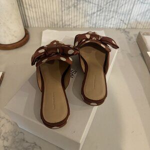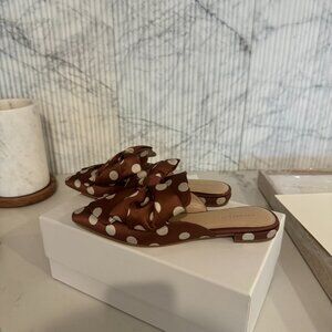 - Something Navy mules in brown and white polka dot print with large bow detail on top