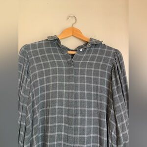 Something Navy Shirt Gray White Plaid Feminine Flannel Peasant Puff Sleeve Top