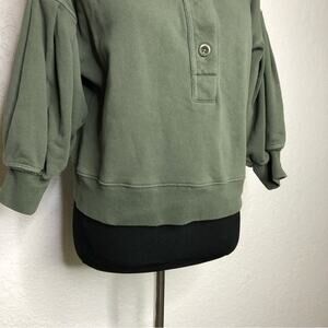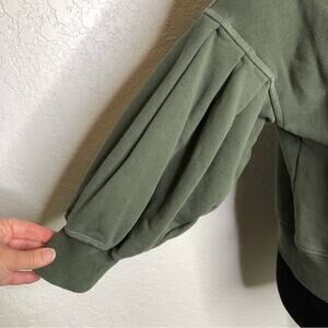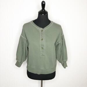Something Navy army olive green pleated balloon sleeve button front top. Pullover style with round neckline. Buttons partway down the front. Midlength pleated balloon sleeves. Ribbed hemline and sleeve cuffs. Cropped fit. Size XXS. Excellent preowned condition. Minor wash wear.