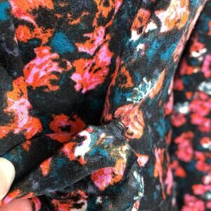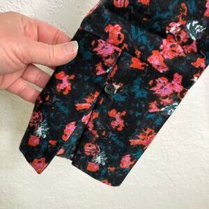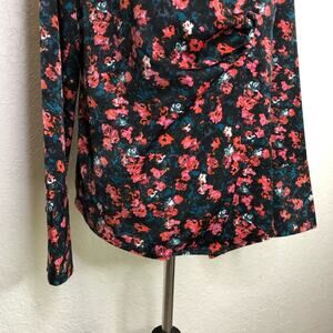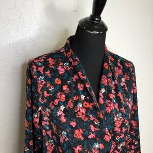 Something Navy black pink floral wrap front top. Collared with wrap front with snap closure. Button slit cuff sleeves. Size Medium. Excellent preowned condition. Minor wash wear.