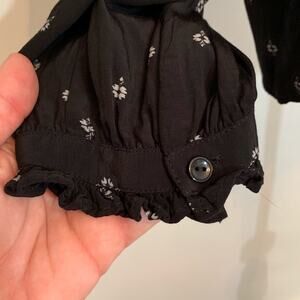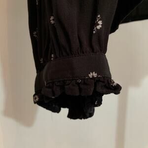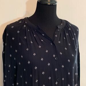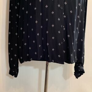 Something Navy button up top. Black with white geometric design. Mock collar. Full button down front. Pleating at neckline and arms. Ruffled button cuff sleeves. Size M. 100% viscose. Machine wash. Excellent preowned condition. Minor wash wear.