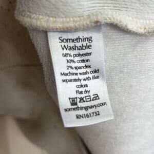 Something Navy size large thick shirt jacket in excellent condition. Off white with tiny specks of different colors. Almost feels like a sweatshirt material. Measures 25” from armpit to armpit and 29” long.