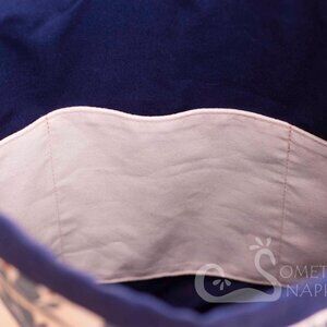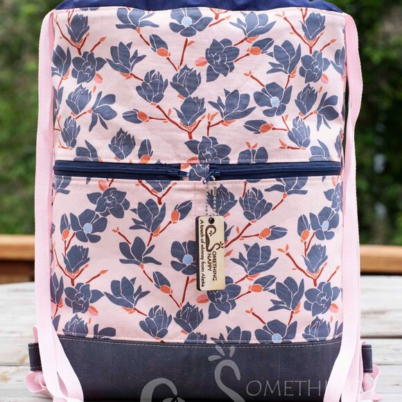 The Magnolia in Sunset Drawstring Backpack is a Something Snappy one-of-a-kind. The bag features a vibrant blue and pink floral design, with two handy zipper pockets on the outside, and three slip pockets on the inside, while still being very roomy. The base is made from imported Portuguese cork.