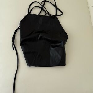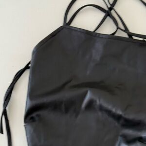 Stylish black faux leather corset top with adjustable straps. Perfect for a bold look.