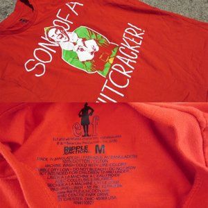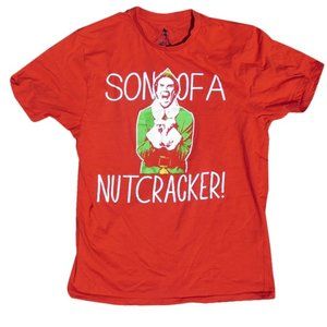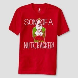 ELF THE MOVIE Menโs Son Of A Nutcracker Shirt Red. Tee features an illustration of Buddy the Elf on the front, plus white text that reads "Son of a Nutcracker."