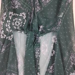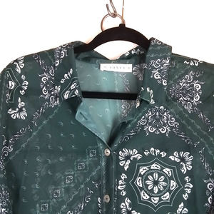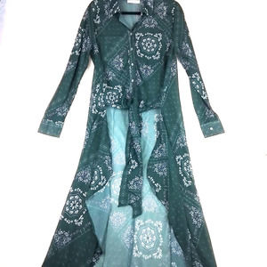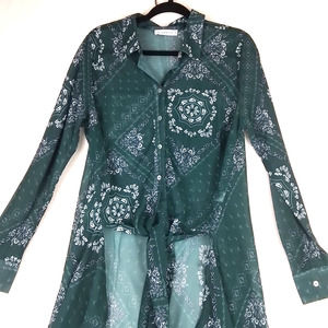 Soncy Semi Sheer High Low Waterfall Blouse Size 0 (12) in Green w/ White Print